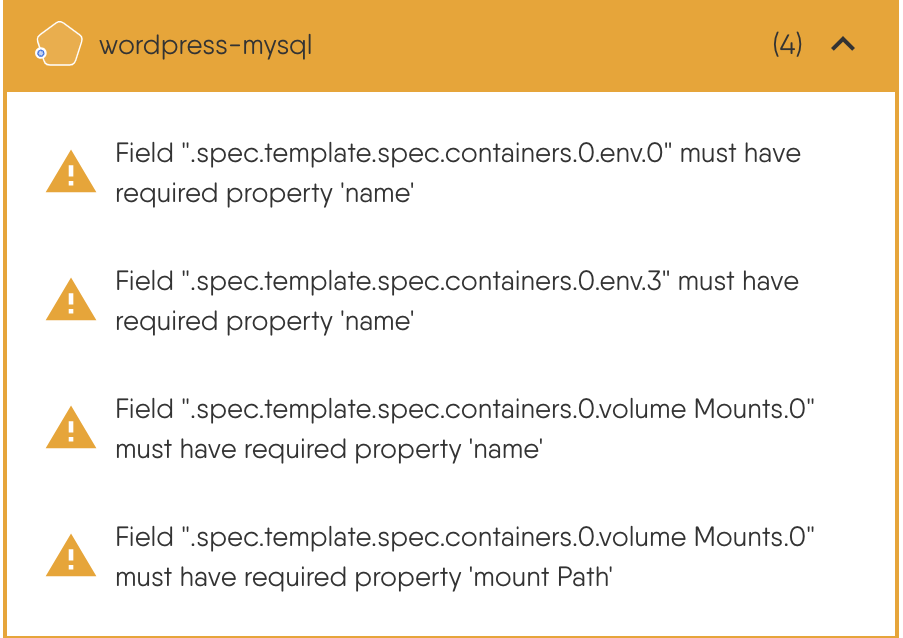 1. Missing Required Field: This happens when a required field is not provided. For example, in the image below, the first error indicates that the field ".spec.template.spec.containers.0.env.0" must have a value.